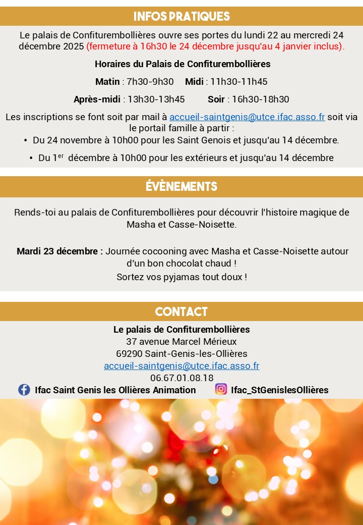 Le palais de Confiturembollières ouvre ses portes pour la période des vacances de fin d’année du lundi 22 au mercredi 24 décembre 2025 (fermeture à 16h30 le 24 décembre jusqu’au 4 janvier inclus).